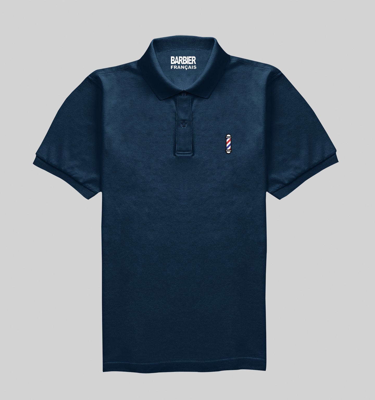 Polo bleu nuit classique confortable en coton bio avec le logo barbier français brodé côté cœur.