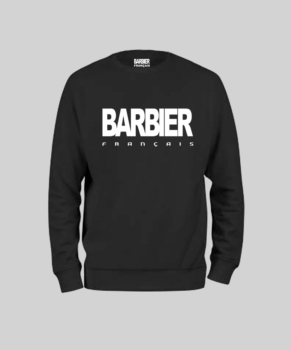 Sweat noir à col rond en coton bio avec barbier imprimé sur le devant en blanc.