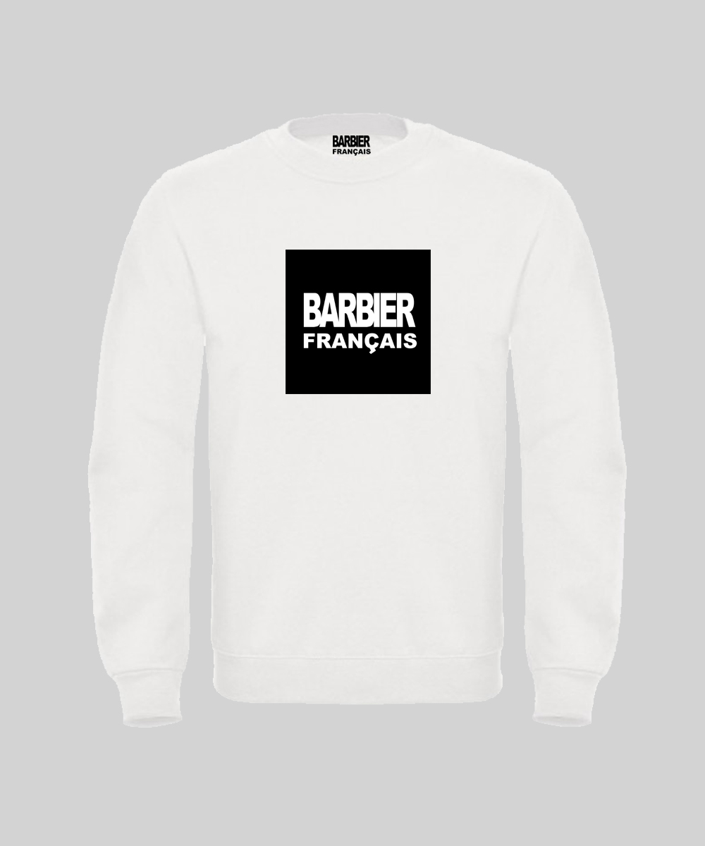 Sweat blanc à col rond en coton bio avec barbier imprimé sur le devant dans un carré noir.
